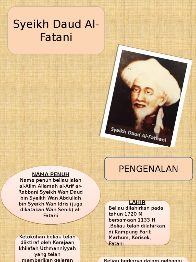 He produced writings in Madhhab Shafii in the. Ketokohan Syeikh Daud al-Fatani sebagai seorang ulama yang ulung tidak perlu dipertikaikan lagi. Syeikh Daud bin Abdullah al-Fathani ialah seorang tokoh ulama Islam berbangsa Melayu kelahiran Pattani1.